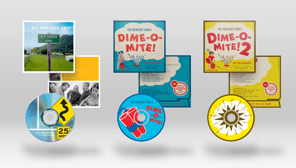 < Previous exampleThe post-ironic revival of old-time Appalachian music at the turn of the century created opportunities for designs that didn’t trade on hillbilly music stereotypes. For my own band we went with a contemporary modern look. For The Mercury Dimes we did a play on vintage toy packaging, in folded paperboard cases from Stumptown Printers. Next example >